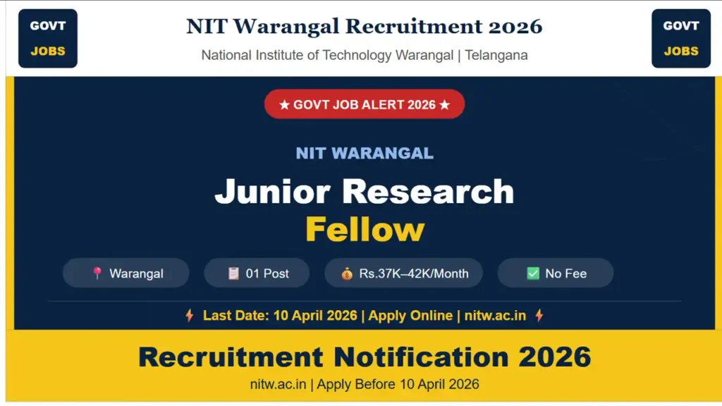 NIT Warangal Jobs 2026 Telangana – National Institute of Technology Warangal (NIT Warangal) has officially released a recruitment notification for the post of Junior Research Fellow. A total of 1 vacancy is available at Warangal, Telangana. Eligible candidates can apply online through the official website nitw.ac.in. The last date to apply is 10 April 2026. There is no application fee for this recruitment. Read the complete details below before applying.