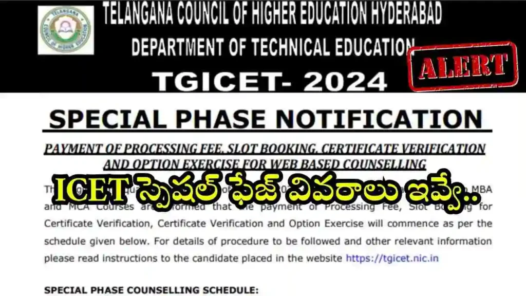 TG ICET ప్రత్యేక దశ కౌన్సెలింగ్ ద్వారా MBA మరియు MCA కోర్సుల్లో చేరాలనుకునే విద్యార్థులకు ఇది చివరి అవకాశం. అర్హత గల అభ్యర్థులు సమయానికి రిజిస్ట్రేషన్ పూర్తి చేసి, సీటు కేటాయింపును పొందవచ్చు.